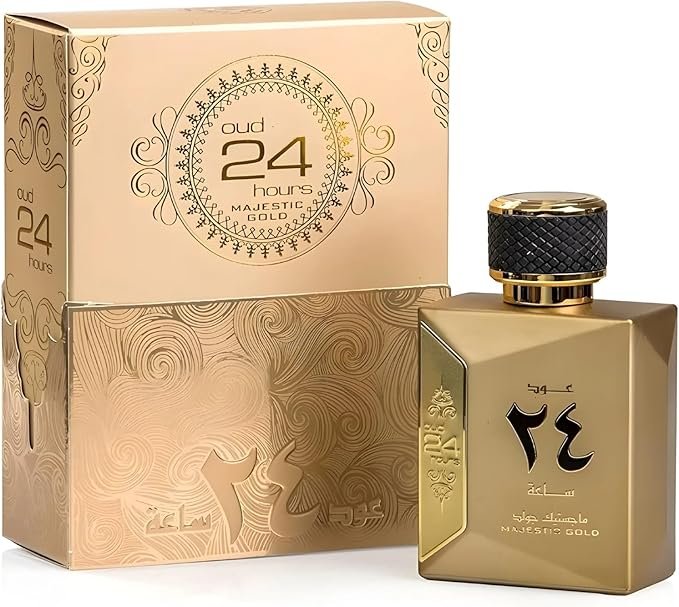 Ard Al Zaafaran Oud 24 Hours Majestic Gold EDP 100 ml eleva la línea Oud 24 con un acabado más suave y refinado.