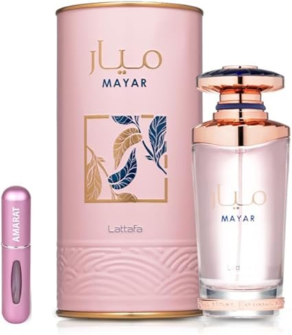Lattafa Mayar EDP 100 ml combina notas jugosas de pera y frambuesa con un corazón de rosa y jazmín, sobre un fondo suave de vainilla y almizcle.